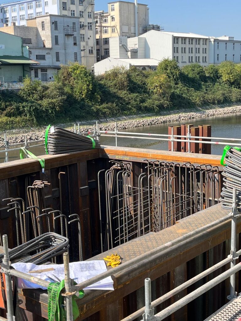 • Spundwandkasten mit Unterwasserbeton verfüllen