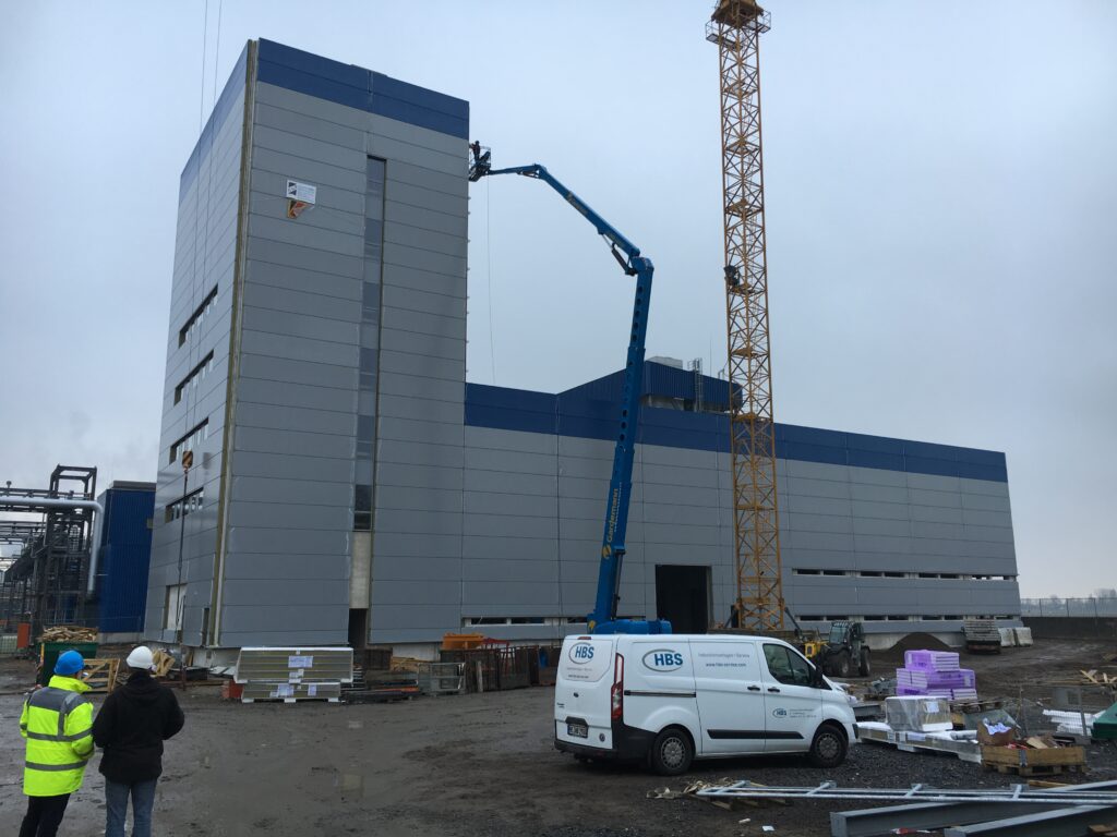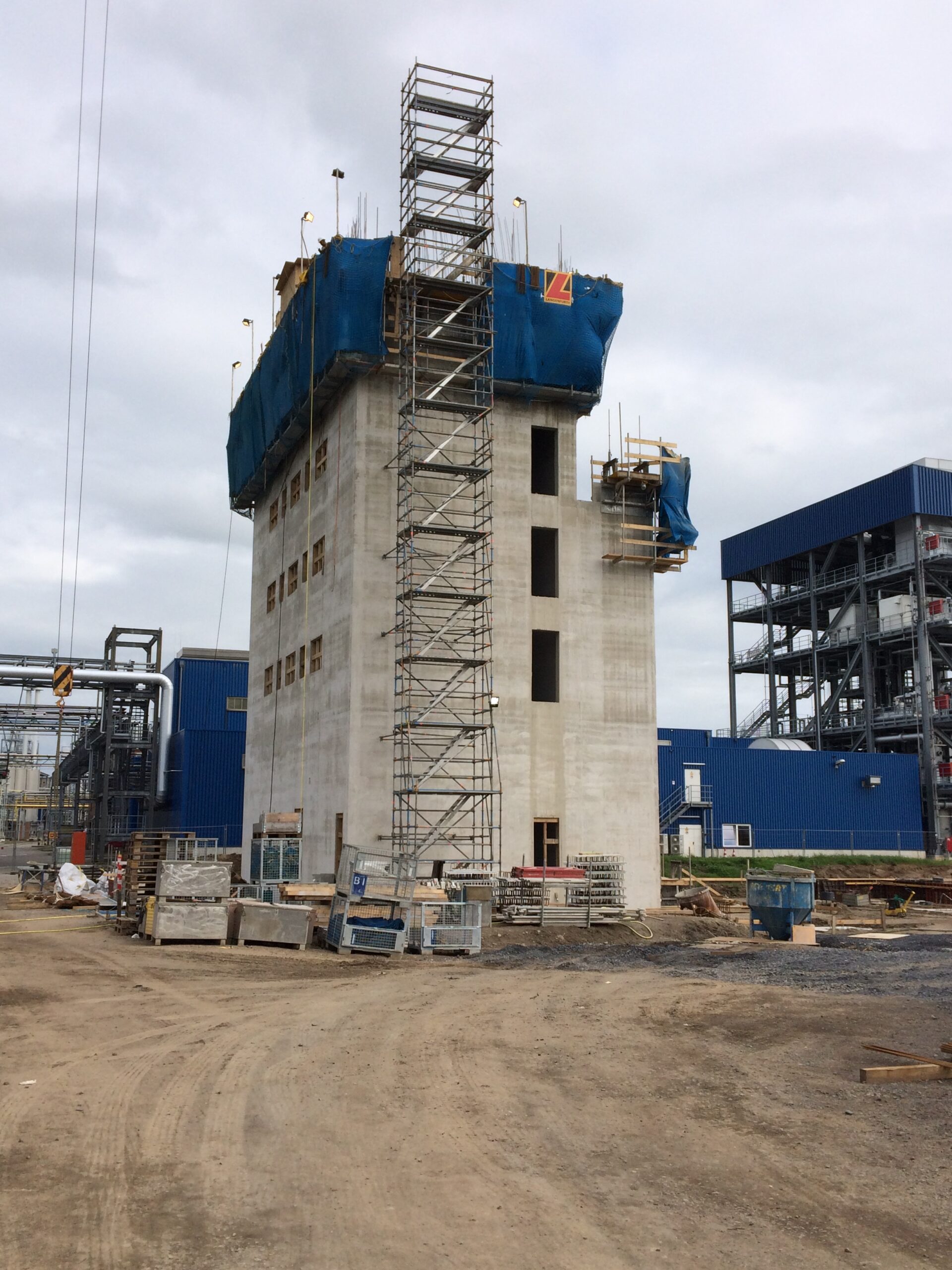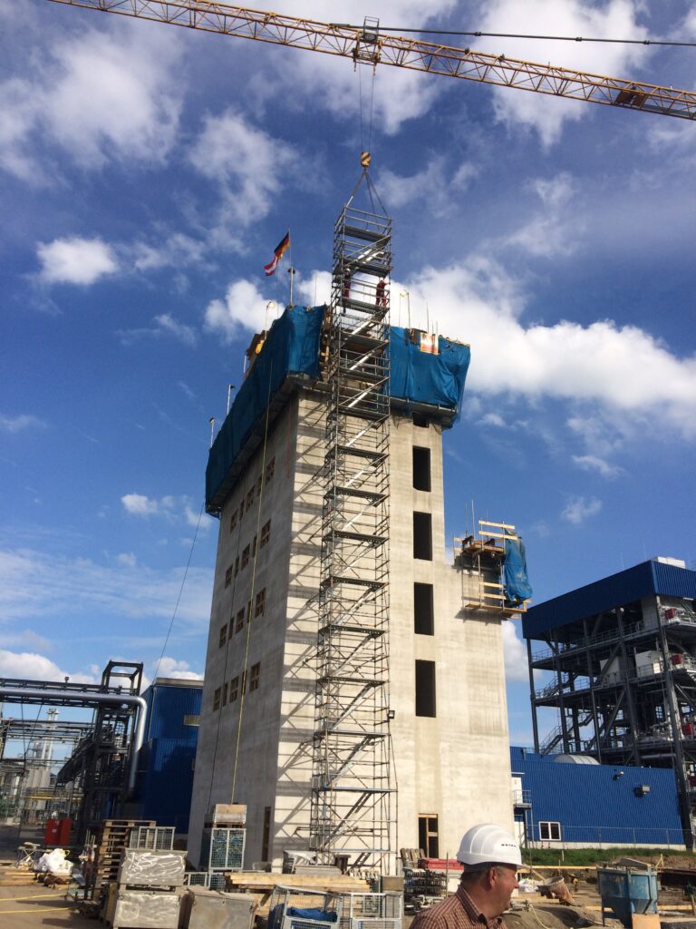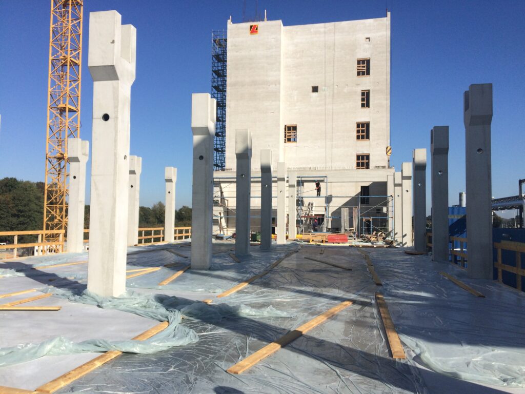 - Ausführung eines ca. 12 m hohen Produktionsgebäudes mit einer Attikahöhe von rund 14 m sowie Turmbauwerk mit ca. 30 m Höhe